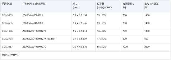 此外,TDK計劃于2023年再推出另外三款執(zhí)行器,以滿足更廣泛的應用要求。目前,這些執(zhí)行器僅作為少量原型樣品供應,尚未量產,具體包括高度為10 mm、位移量為16 μm的COM10S5;高度為27 mm、位移量為47 μm的COM27S3(帶引線型);以及高度為30 mm、橫截面為7 mm x 7 mm、位移量為55 μm、推力高達2600 N的COM30S7。