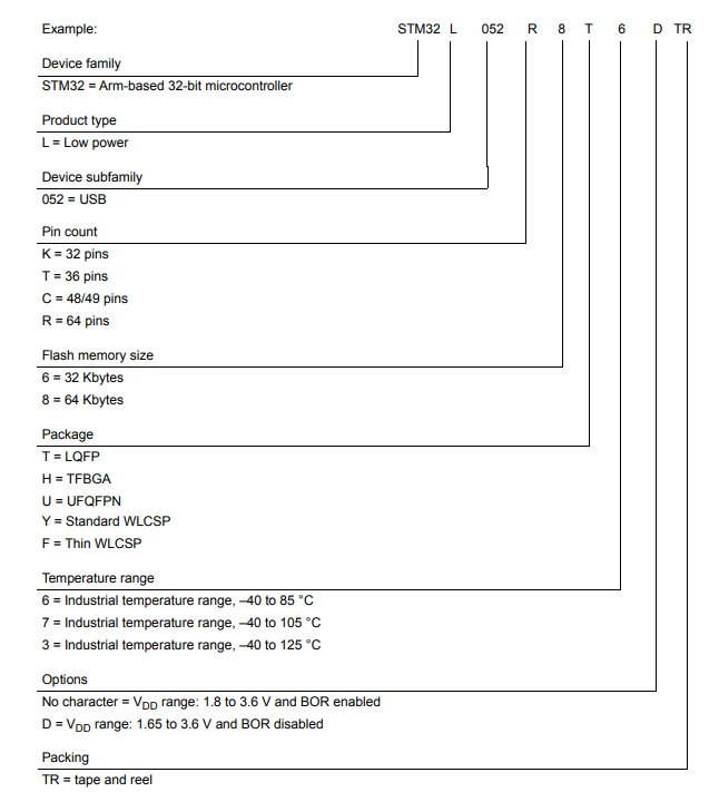 6、電源管理:操作電壓范圍為1.8至3.6 V(斷電時降至1.65 V),具有BOR(斷電復位)選項,可在-40至+85°C的溫度范圍內工作。