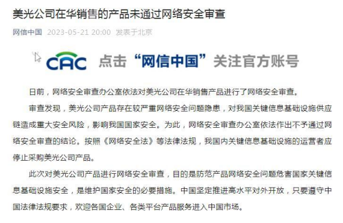 于是中國在今年3月底對美光科技展開網絡安全審查,目前結果已經出爐了。