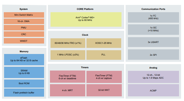 LPC860的配套外設包括一個CRC引擎、I2C總線接口、I3C總線接口、多達三個USART、兩個SPI接口、一個多速率定時器、自喚醒定時器、兩個具有硬件死區時間插入和正交解碼的FlexTimer、一個12位ADC、一個模擬比較器、功能可通過開關矩陣配置的I/O端口、一個輸入模式匹配引擎和多達54個通用I/O引腳。