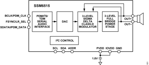數(shù)字輸入功能無需外部數(shù)模轉(zhuǎn)換器(DAC)。SSM6515具有微功耗關(guān)斷模式,采用1.8 V PVDD電源時(shí),關(guān)斷電流典型值為6 μA,無輸入時(shí)可自動關(guān)斷。該器件還內(nèi)置爆音與咔嚓聲抑制電路,盡可能減小器件開啟和關(guān)閉期間輸出端的電壓突波。輸入支持各種串行音頻格式,包括I2S、時(shí)分多路復(fù)用(TDM)和脈沖密度調(diào)制(PDM)。